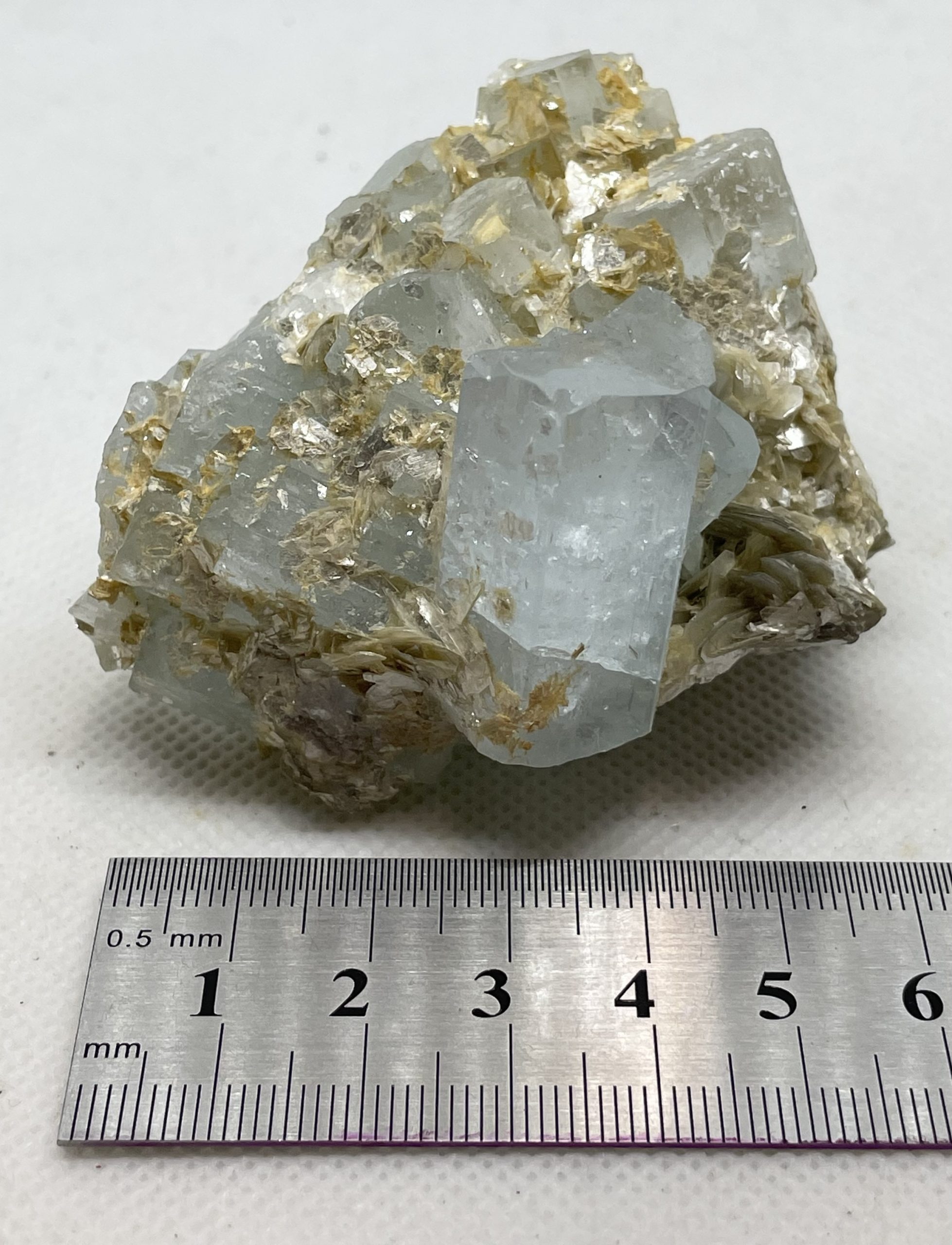 A cluster of light blue terminated Aquamarine crystals with bladed Muscovite