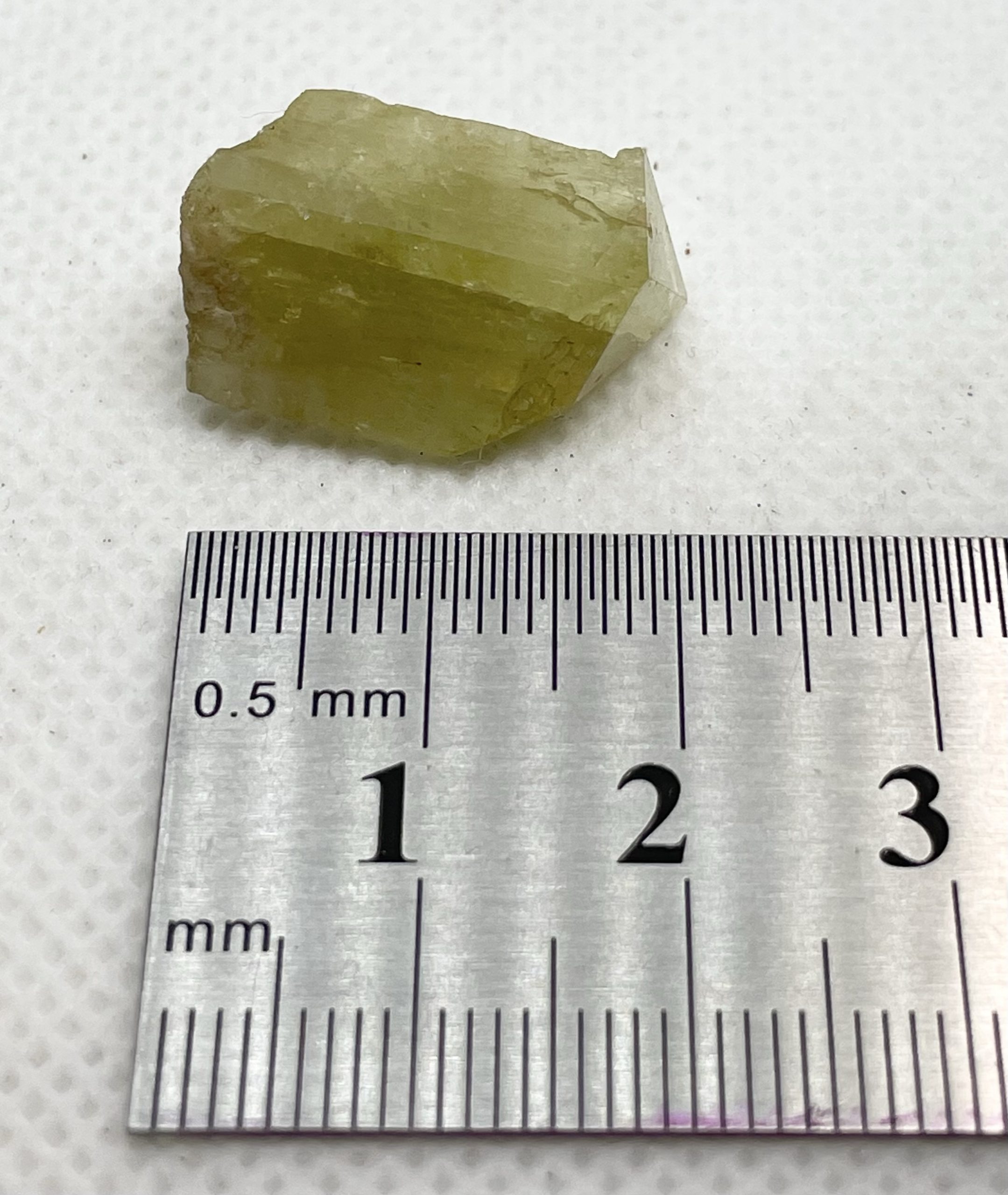 A single lustrous and terminated crystal of yellow green saturated Brazilianite.