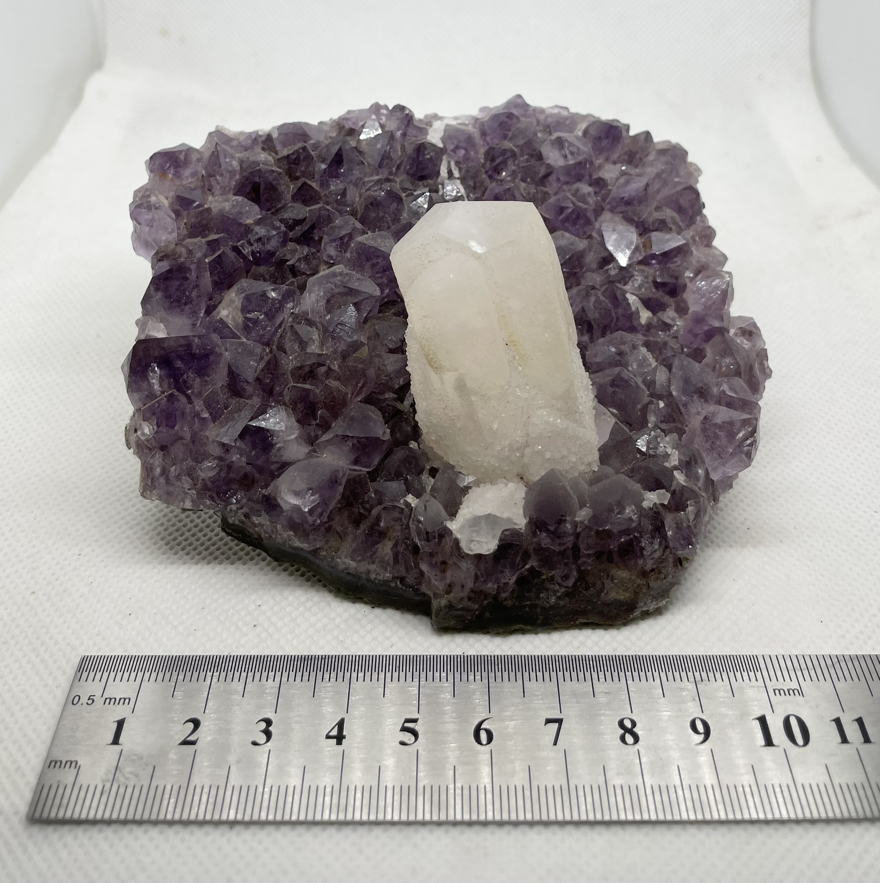 A well defined nail head Calcite with secondary Calcite druze perched atop a plate of Amethyst.