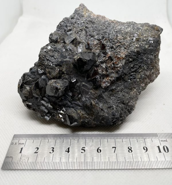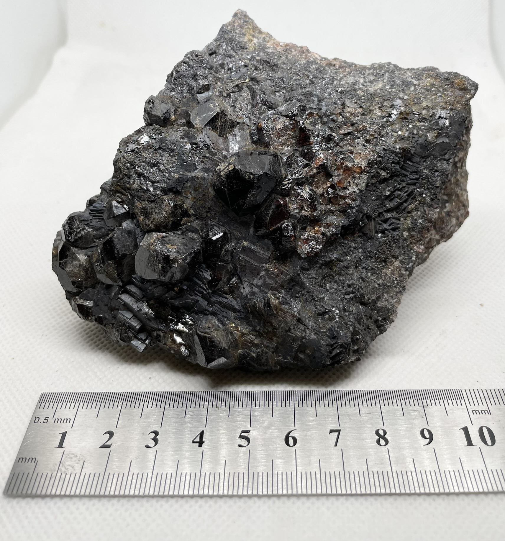 A hand sized specimen exhibiting a matrix of galena with multiple well-defined Garnet crystals.