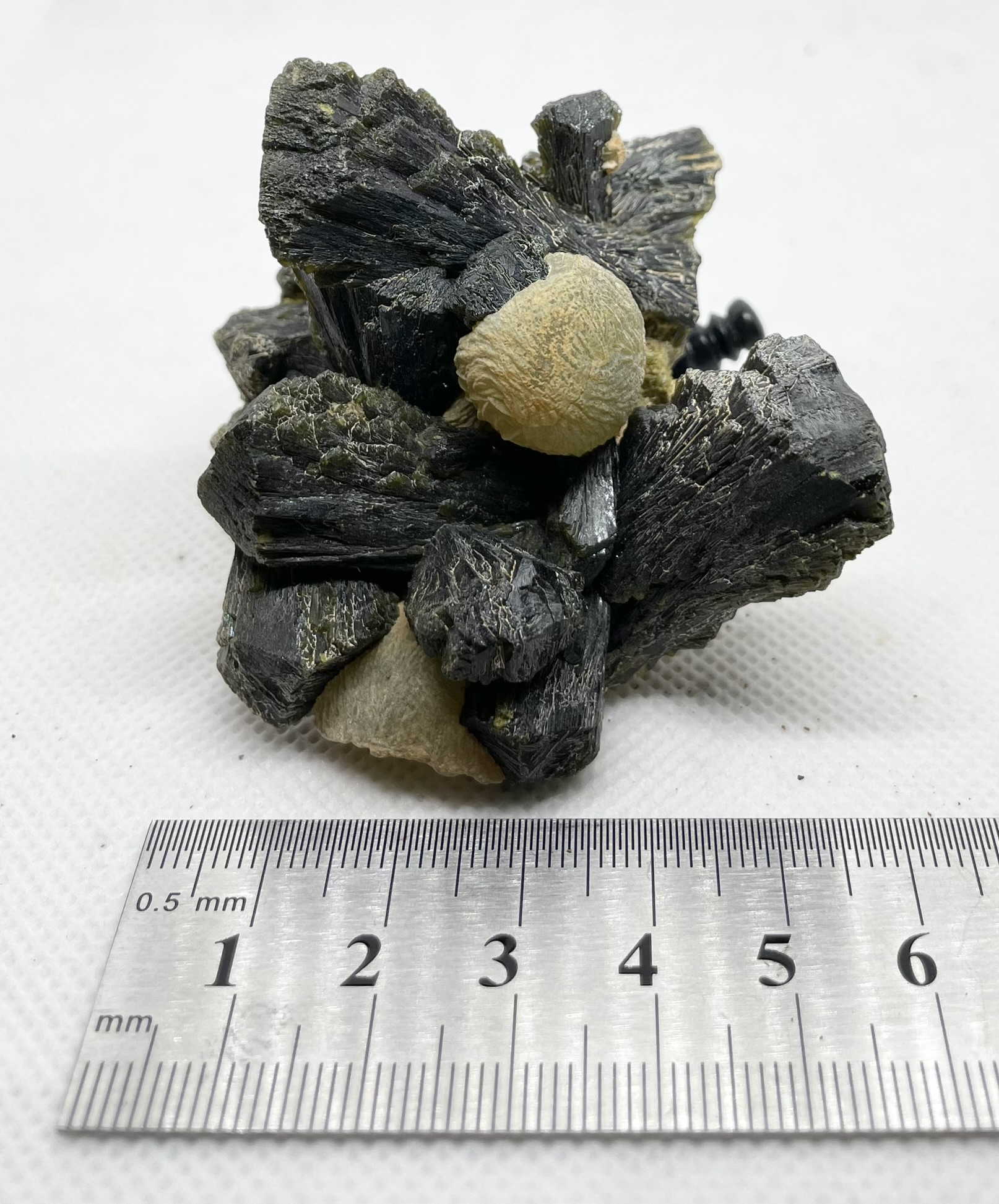 Rounded crystalline masses of bladed Prehnite atop dark green splays of Epidote