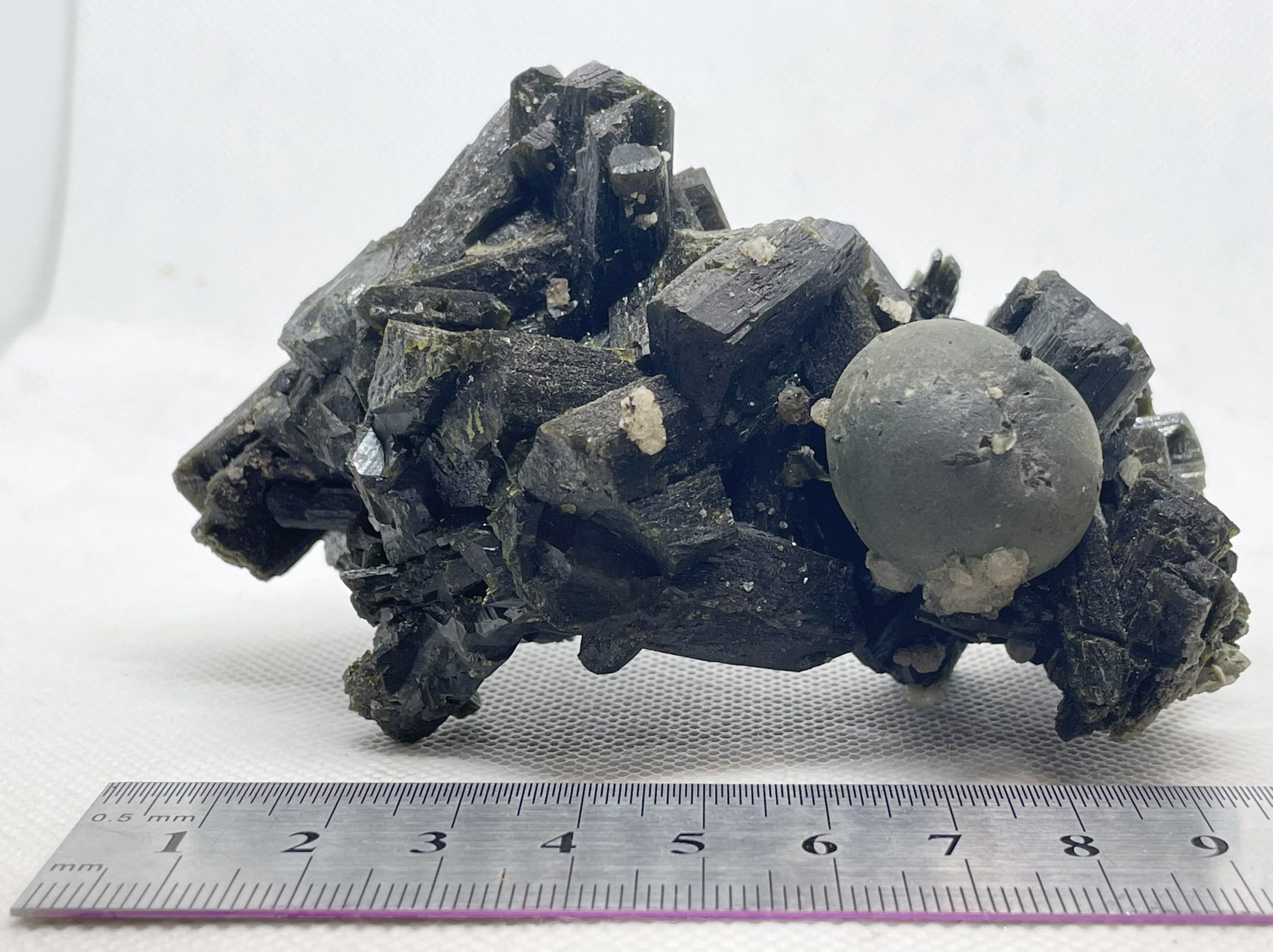 A single spherical crystal of Prehnite nestled within deep green and lustrous terminated crystals of Epidote.