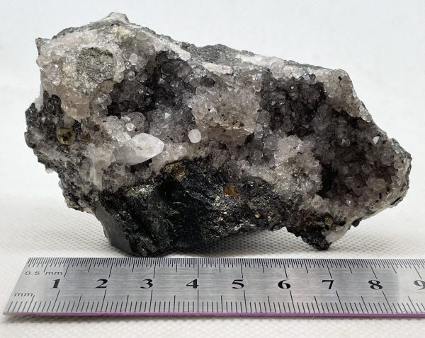 A richly mineralised specimen exhibiting Goethite excluded Quartz over dark green Dioptase with associated Calcite & Sulfides