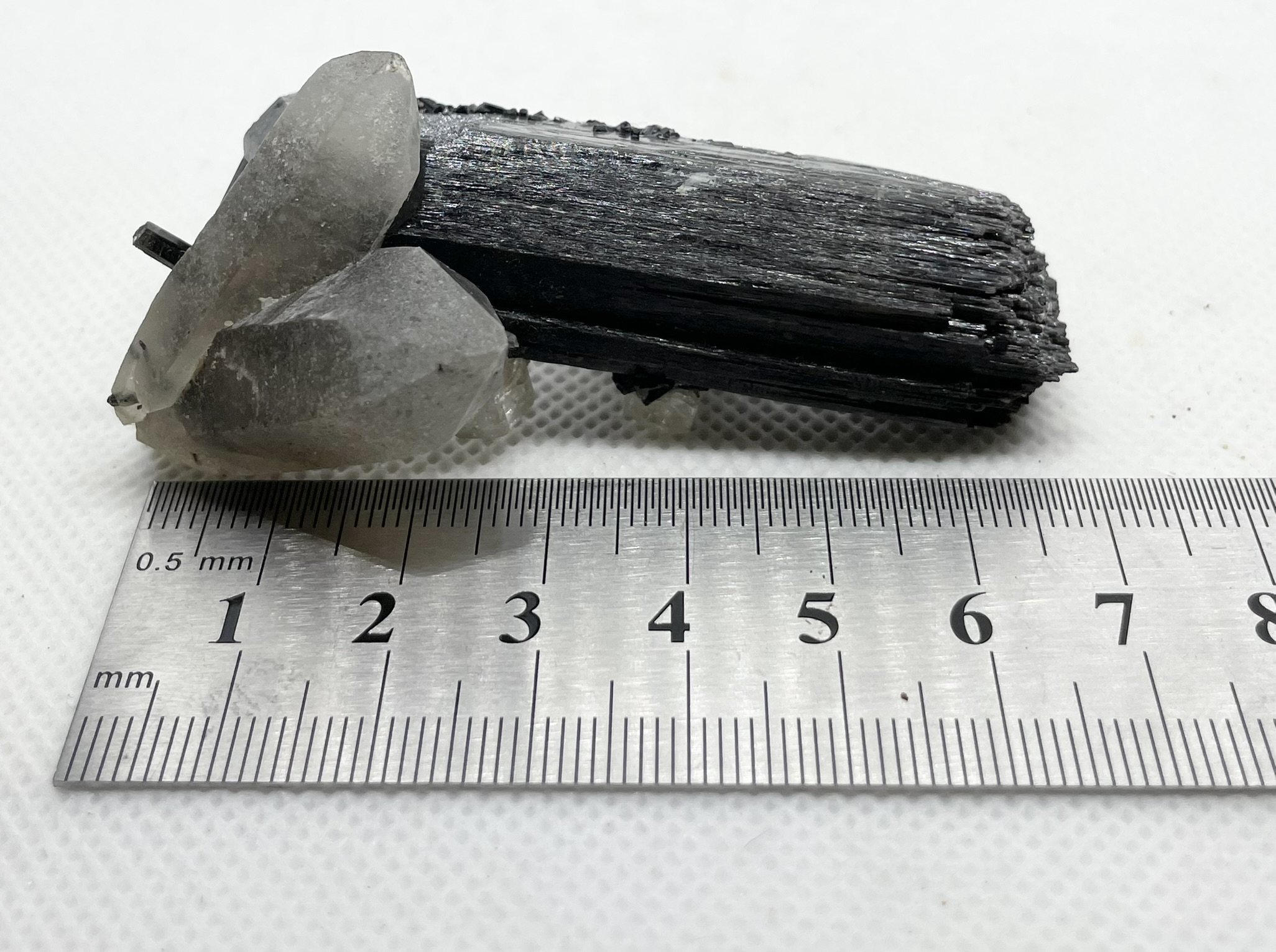 An aesthetic specimen exhibiting a single black Schorl, with associated barrel shaped Beryl crystals and interlocking doubly terminated Quartz.
